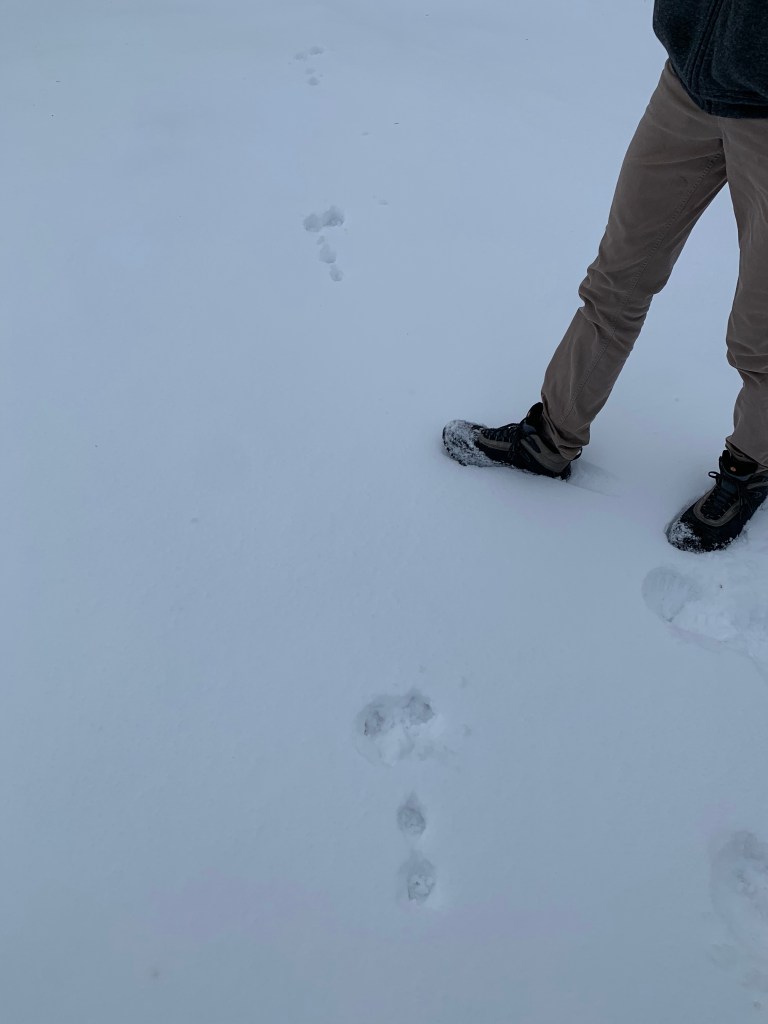 River Otter tracks and slideRiver Otter tracks, notice the webbing between the toes.Sharp-tailed or Ruffed Grouse. A Sharp-tailed was seen adjacent to these tracks in a bush but Ruffed Grouse also seen in near proximity.Snowshoe Hare in a hurry.Squirrel bounding. Most likely Red Squirrel.Dark-eyed Junco near my feeder. Bird seen making tracks.Deer. Probably Mule Deer. Not too often the snow is just right to show dewclaw marks.