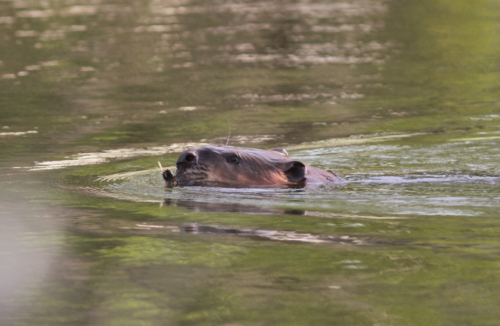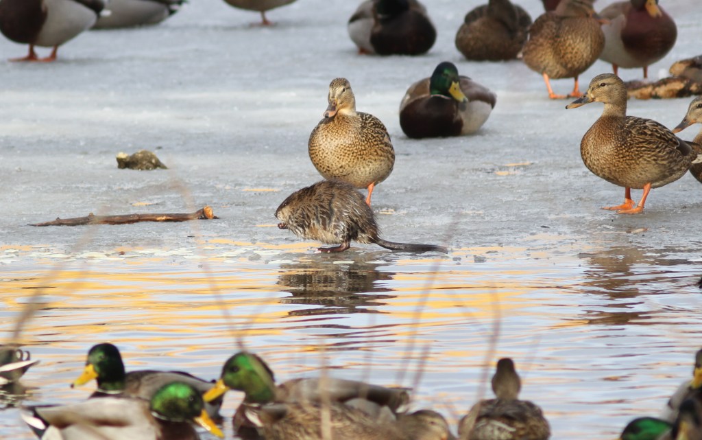 Yesterday morning I was standing beside a known beaver pond when a beaver swam up to its lodge and disappeared under the surface and into its underwater entrance. Within the same minute a muskrat swam in exactly the same path and did the same thing. I’ve heard that muskrat will sometimes inhabit beaver lodges and be tolerated by the beavers. There is a clip somewhere from inside a beaver lodge showing this and it could even be possible that the muskrat(s) perform some maintenance inside an active lodge. Maybe this is the reason they are tolerated? The encounter yesterday with both provided an opportunity to get some comparison pictures of these two mammals to really see the size difference.