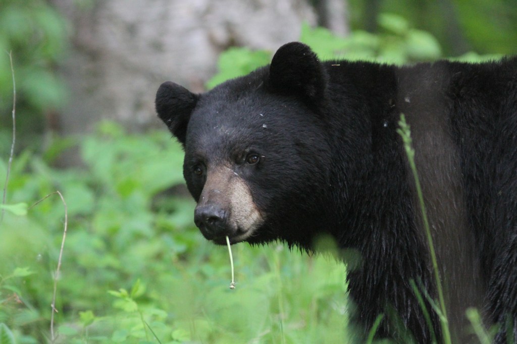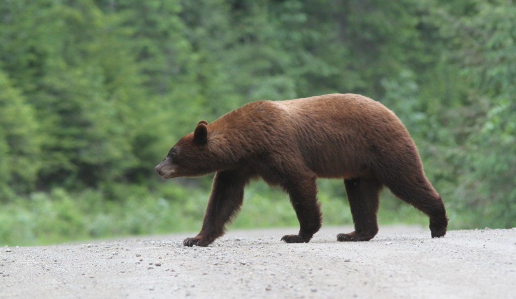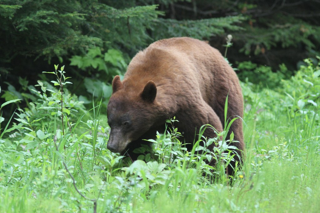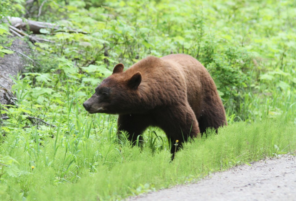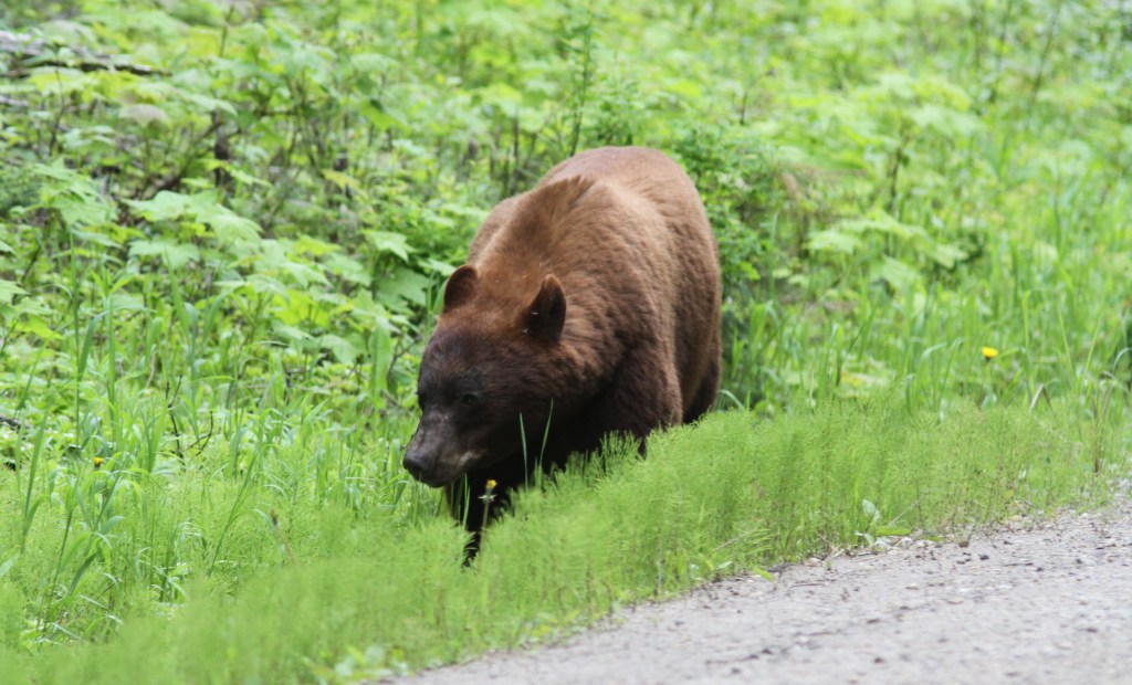 Last weekend I was able to spend some time watching a cinnamon-coloured Black Bear work an area of plants to find the ones he/she wanted to eat. It reminded me of a person transecting a beach with a metal detector. The bear would walk in a zig-zag nose to the ground. It was apparent it wasn’t using its eyes at all but, instead, was relying on its keen nose. It was following a roadside and would switch sides of the road sporadically, covering each side. It was very picky and not just munching down anything green. I guess you can afford to be picky in mid June.