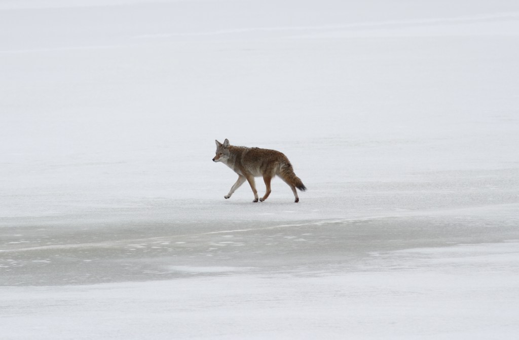 Coyotes become more visible once there is snow on the ground. A friend and I watched this one successfully pounce through the snow on a vole yesterday right after it crossed this lake.