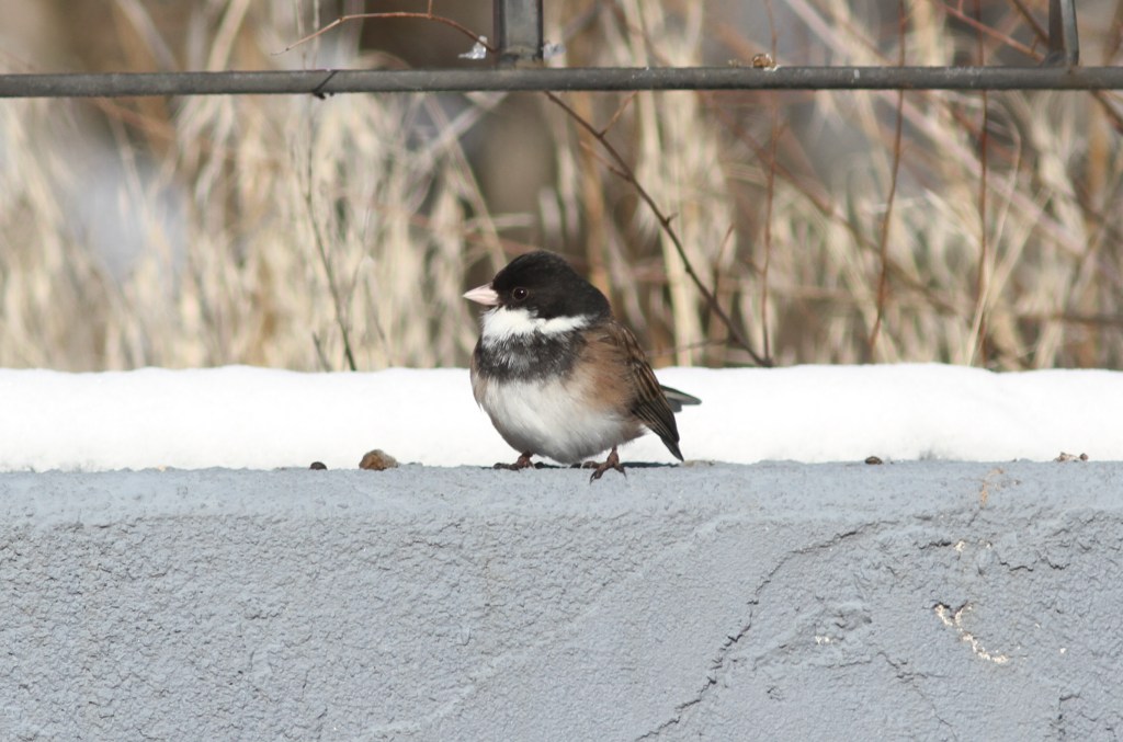 An Oregon Junco with some abnormal white feathers on its throat in my backyard. Almost looks like a chickadee.