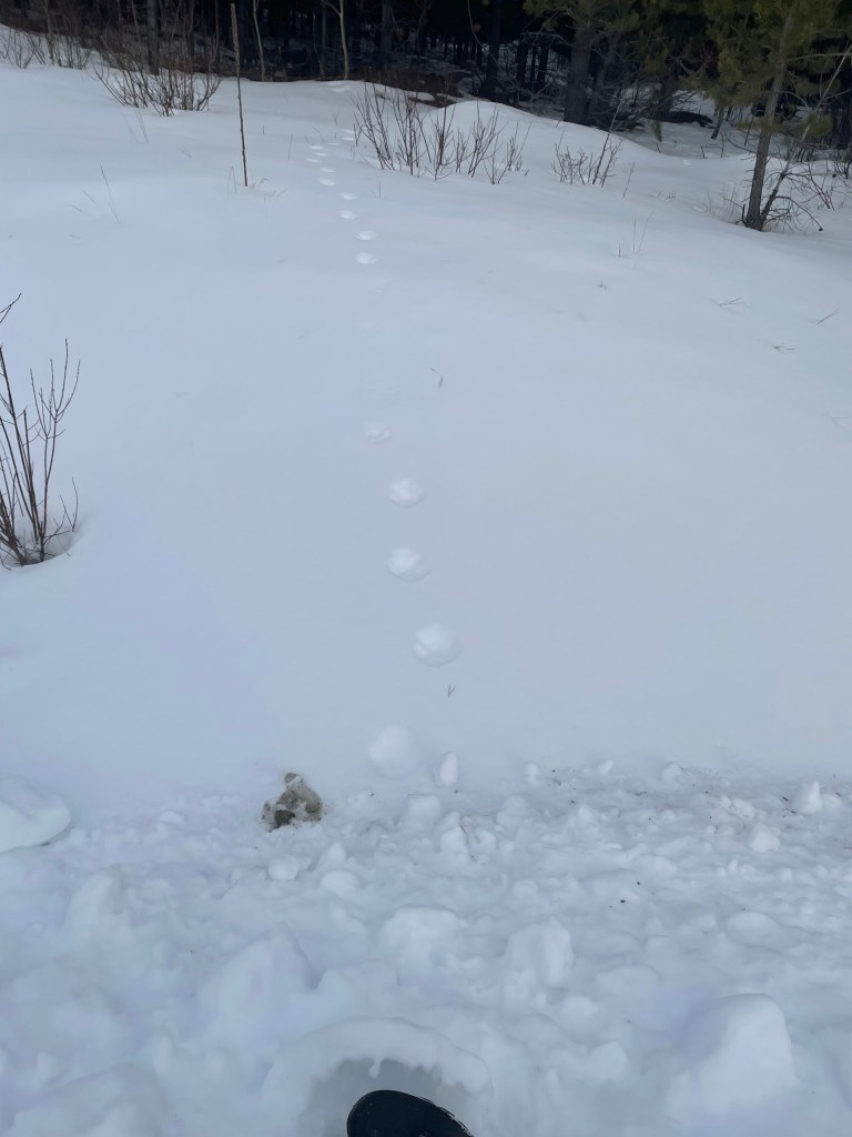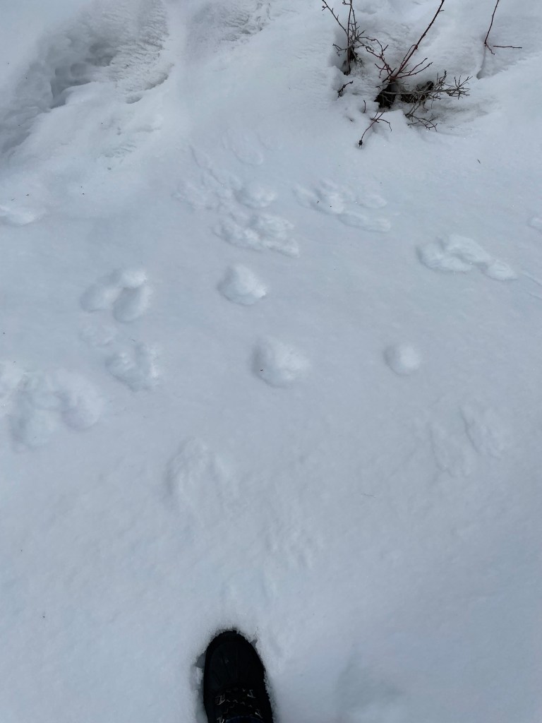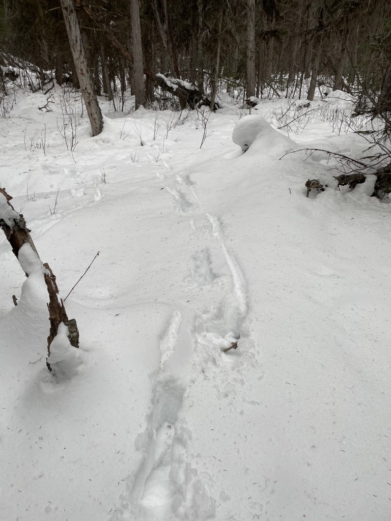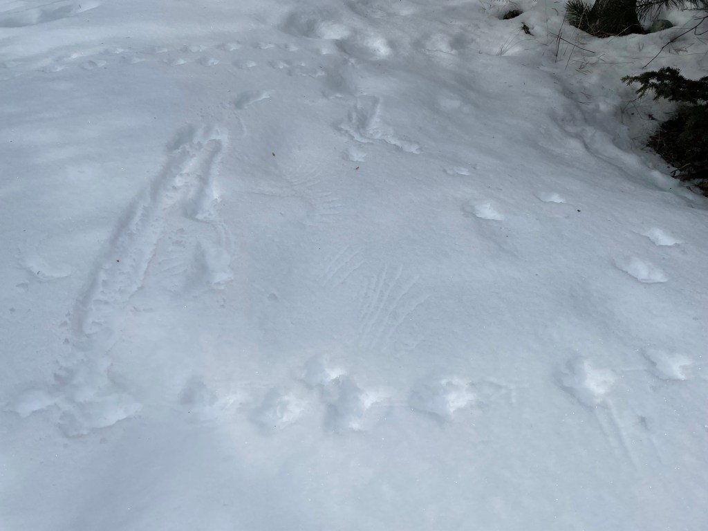 Some type of Grouse, possibly Dusky Grouse based on habitatGrouse wing marks probably landing and skidding to a stop on the left and taking off on the right?Canada Lynx gait and my gaitCanada LynxCanada LynxCanada Lynx showing the different types of snow. Probably snow blown hardened in the middle so it didn’t break through.Moose in very deep snow almost looking like a deer with those dragsTextbook Red Squirrel trackRed Squirrel showing tail dragThought to be Short-tailed Weasel in very deep and light/powdery snow. Thanks to a facebook ID group for suggestions.Snowshoe Hare activitySnowshoe Hare and Lynx prey and predatorSnowshoe Hare on the move