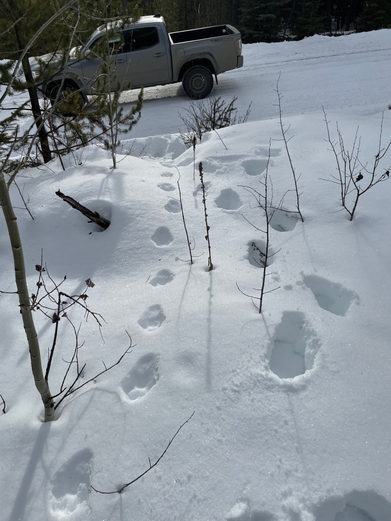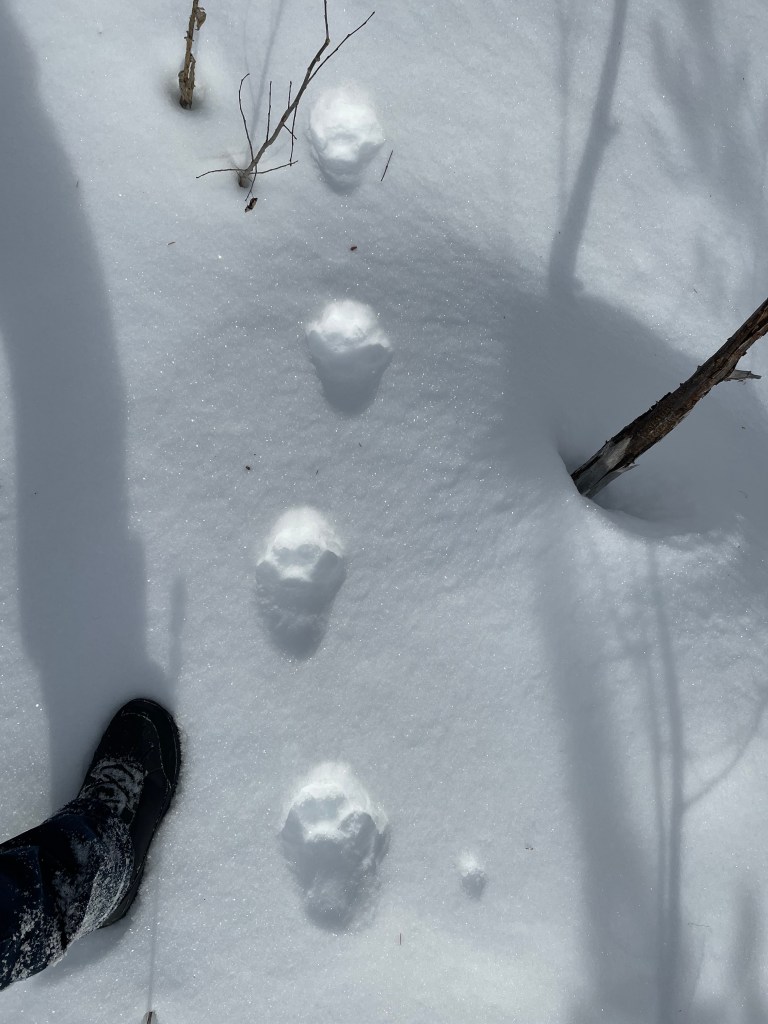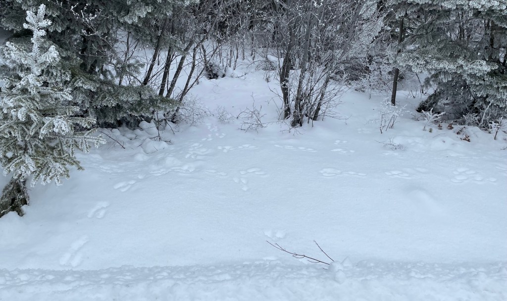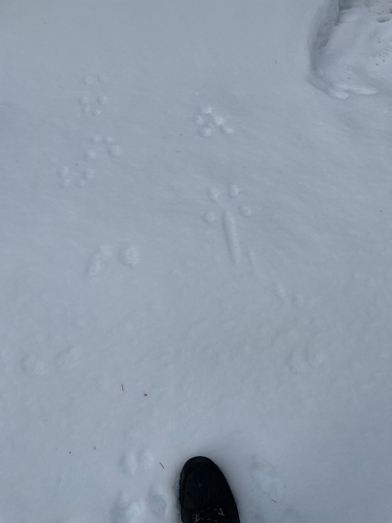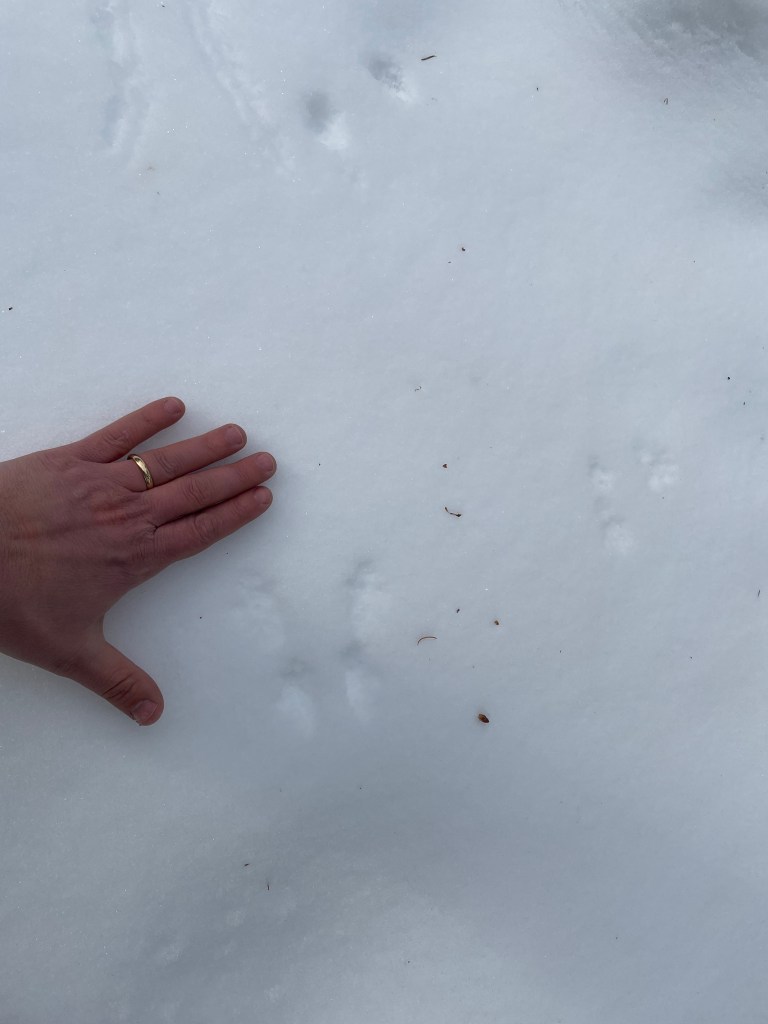 Some type of Grouse, possibly Dusky Grouse based on habitatGrouse wing marks probably landing and skidding to a stop on the left and taking off on the right?Canada Lynx gait and my gaitCanada LynxCanada LynxCanada Lynx showing the different types of snow. Probably snow blown hardened in the middle so it didn’t break through.Moose in very deep snow almost looking like a deer with those dragsTextbook Red Squirrel trackRed Squirrel showing tail dragThought to be Short-tailed Weasel in very deep and light/powdery snow. Thanks to a facebook ID group for suggestions.Snowshoe Hare activitySnowshoe Hare and Lynx prey and predatorSnowshoe Hare on the move